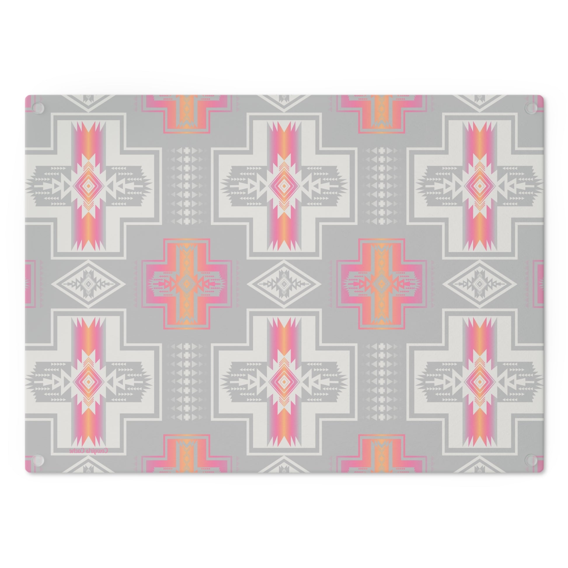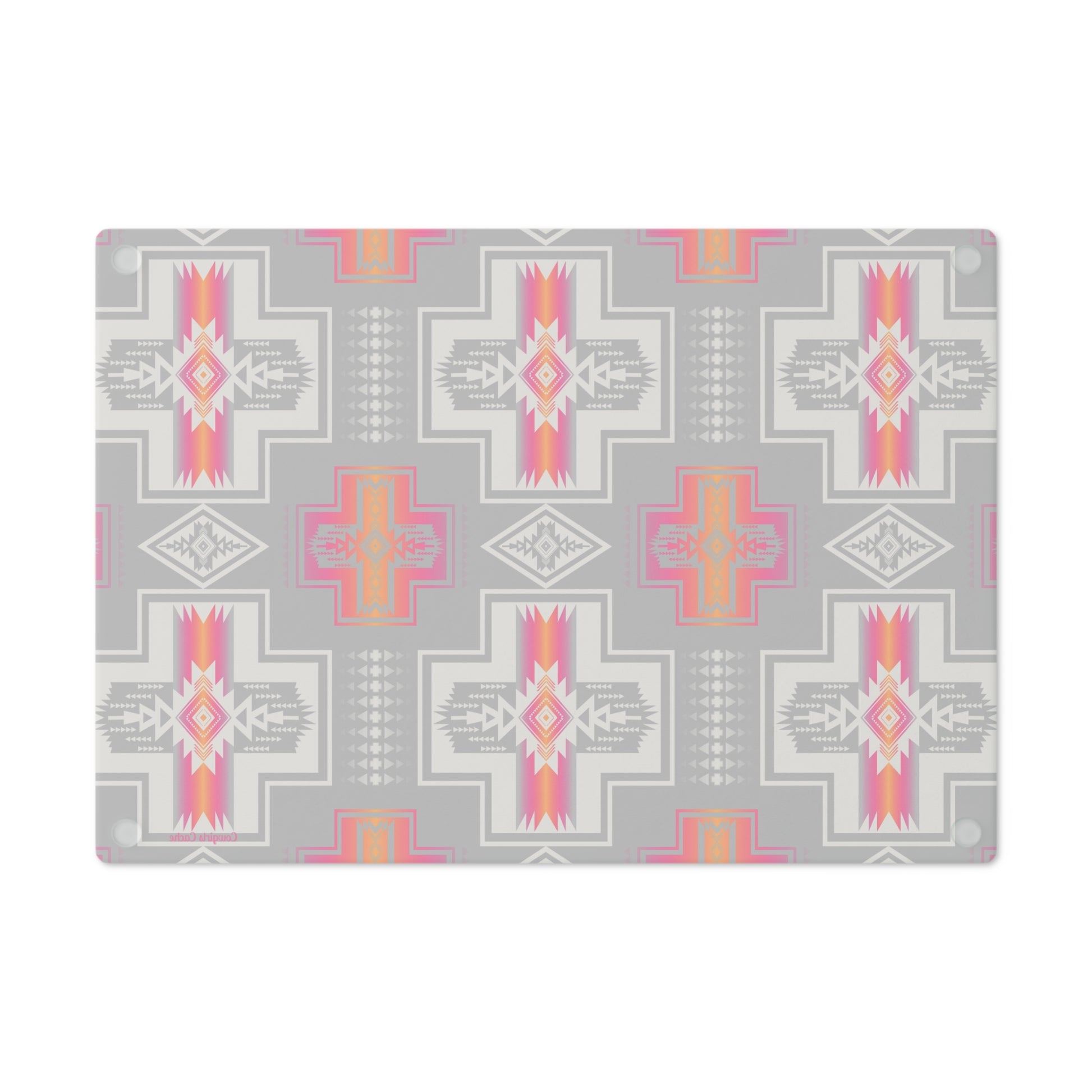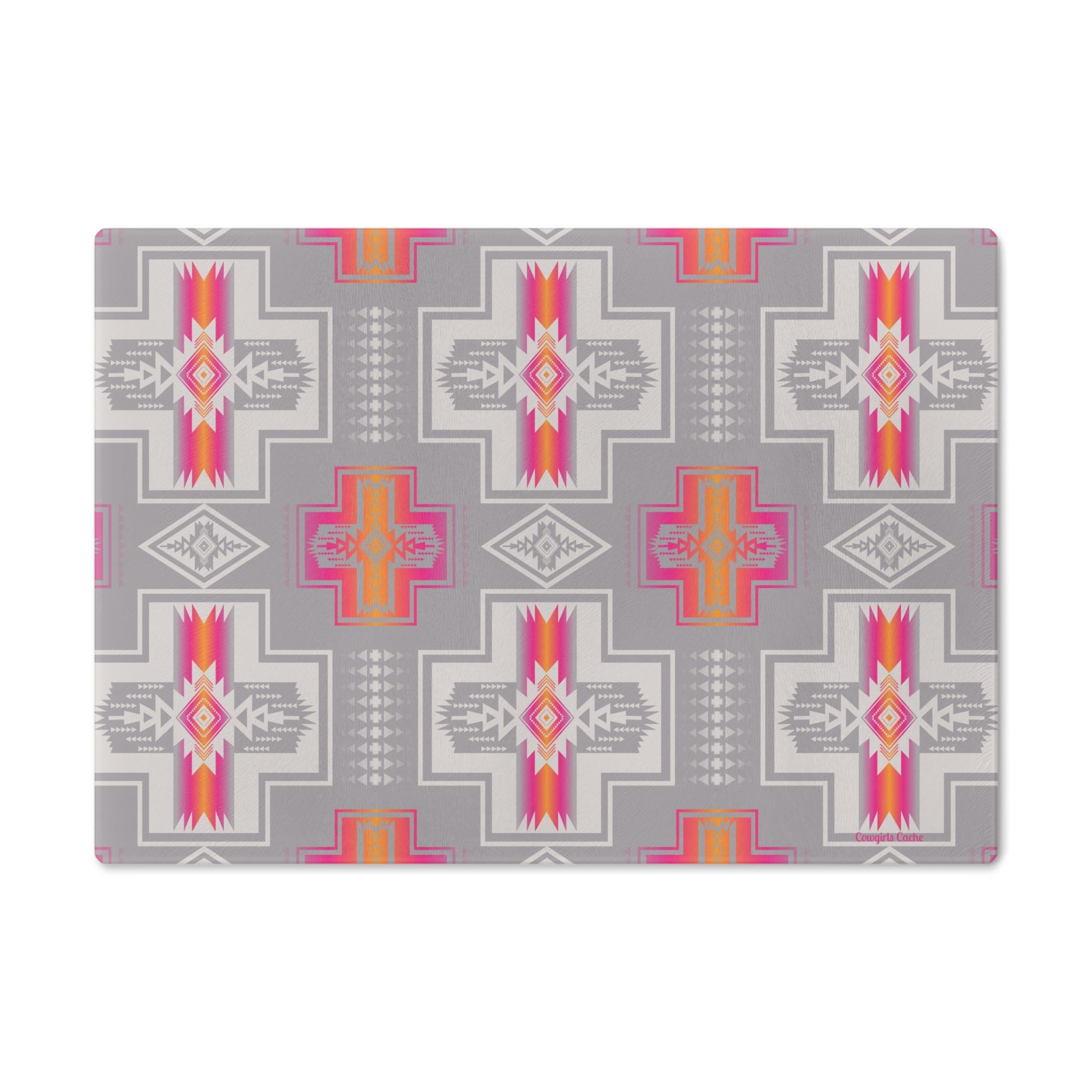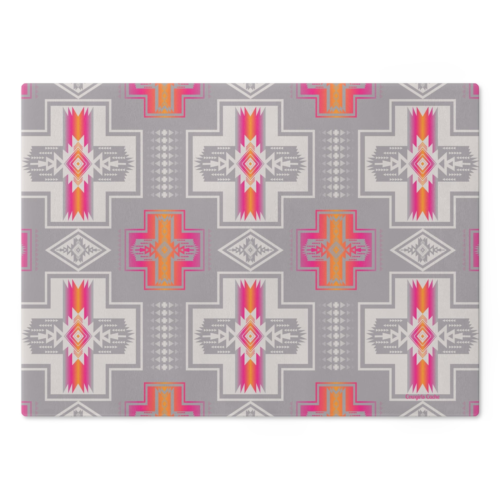 This Native American print Pink Glass Cutting Board adds a touch of culture and color to your kitchen. Perfect for those who appreciate unique designs and want to elevate their cooking experience. Ideal for Western, Ranch or Farm Kitchen.